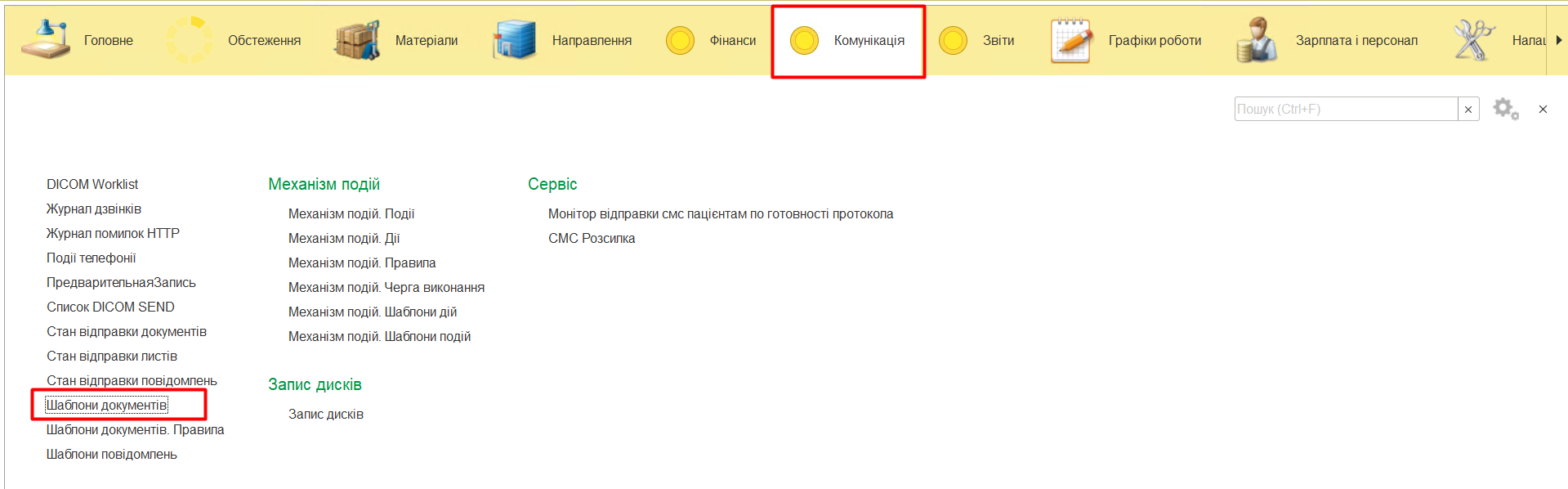 Для роботи з шаблонами використовується довідник «Шаблони документів», який знаходить в головному меню «Комунікація» - «Шаблони документів».
