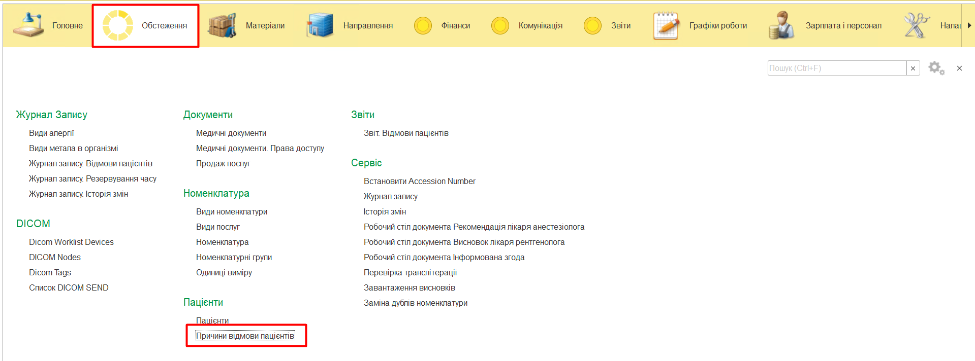 Довідник знаходиться в меню «Обстеження» - «Причини відмови пацієнтів»