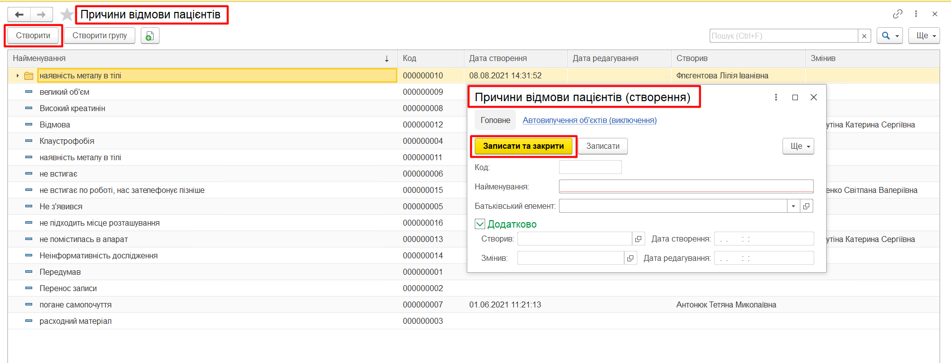 Для створення нової причини відмови необхідно натиснути кнопку «Створити» та заповнити реквізит «Найменування» у новому вікні, після чого натиснути кнопку «Записати та закрити».