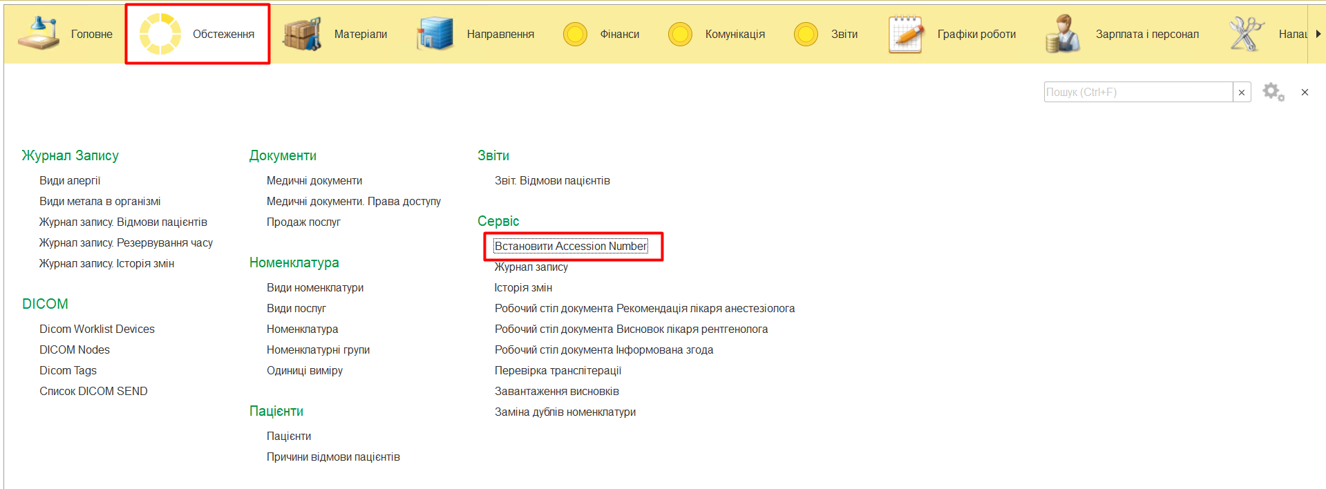 Для цього необхідно скористатися меню «Обстеження» - «Встановити Accession Number»