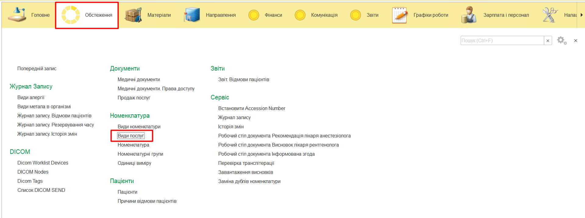 До номенклатури відносять всі послуги які виконуються у медичному центрі, а також матеріали які списуються. Довідник знаходиться в меню «Обстеження» - «Номенклатура».