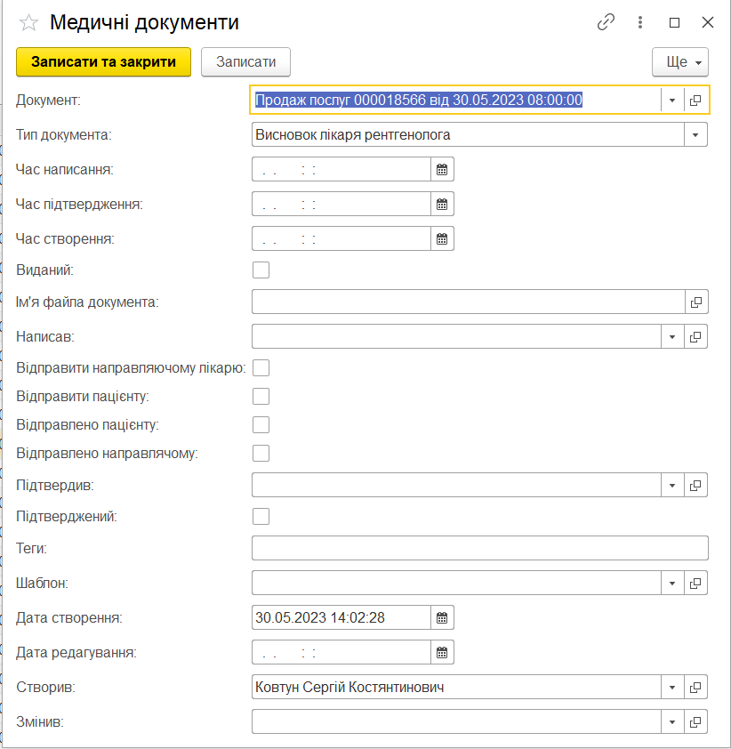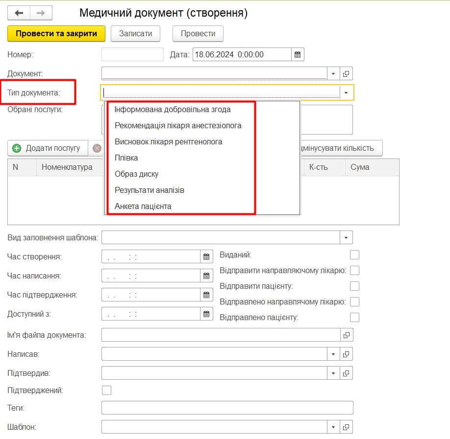 Довідник «Медичні документи» призначений для збереження всіх типів документів. Довідник знаходиться в меню «Обстеження» - «Медичні документи»