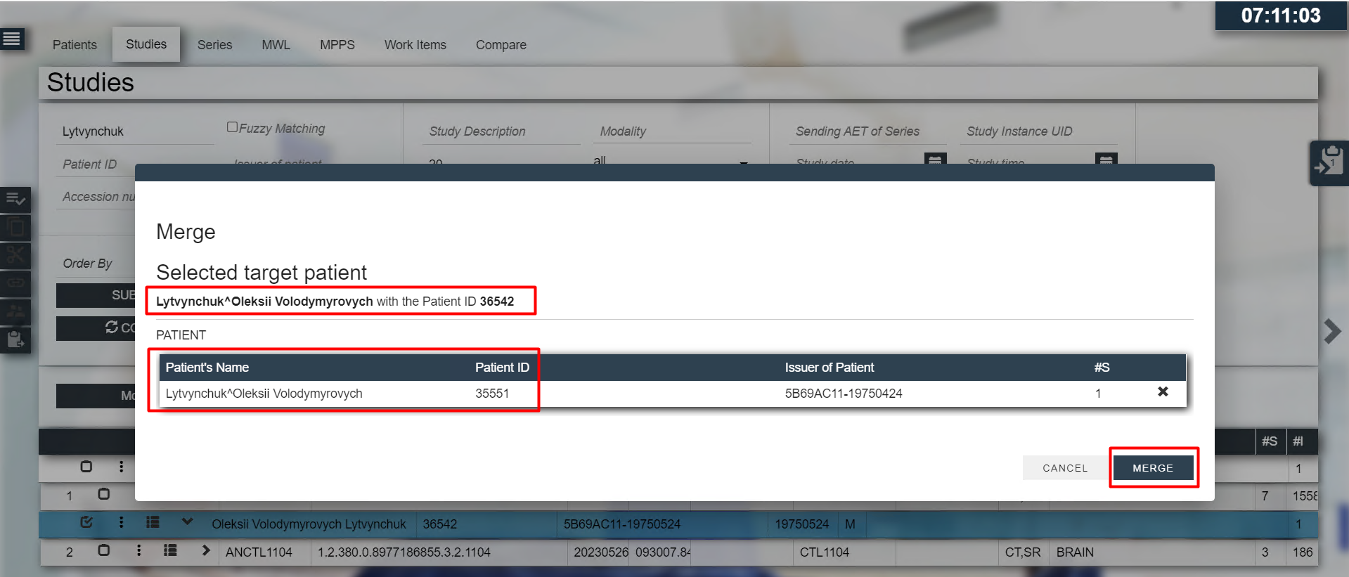 6. У PACS - з'явиться вікно з попередженням, що пацієнт з PatientID 00001 буде об'єднано з пацієнтом PatientID 00002.