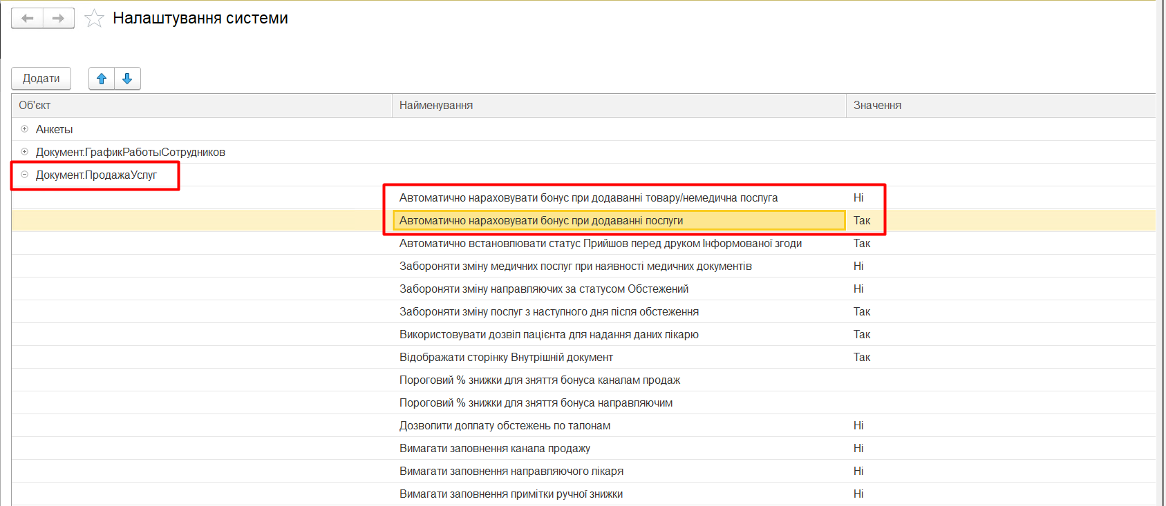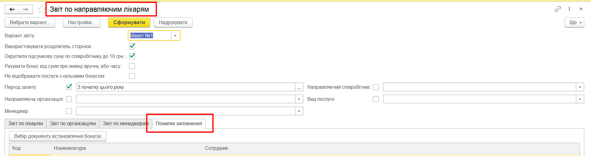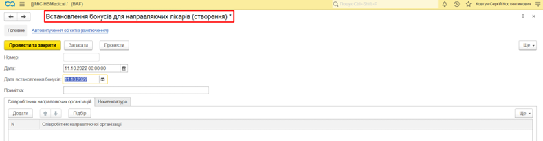 Нарахування бонусів по лікарю відбувається згідно вказаної в документі номенклатури.