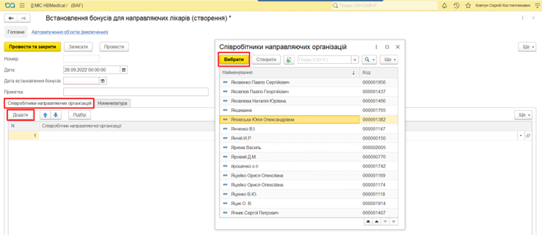 Якщо бонуси нараховуються по різним відсоткам/сумам для кожного направляючого лікаря, потрібно на вкладці «Співробітники направляючої організації» натиснути «Додати» та обрати співробітників направляючої організації.