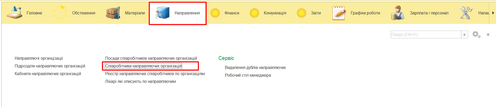 Щоб можливо було обрати «Направляючу організацію» потрібно зробити «Реєстр направляючих співробітників по організаціям» після цього в документі Продаж послуг можливо буде вибрати
