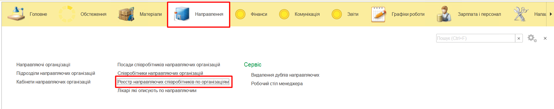 «Реєстр направляючих співробітників по організаціям» - список, який відіграє безпосередню роль у відповіді на питання «хто, де і ким працює» об’єднуючи в собі інформацію з усіх вищезгаданих довідників, при пошуку і виборі співробітника, коли пацієнт приносить з собою направлення.