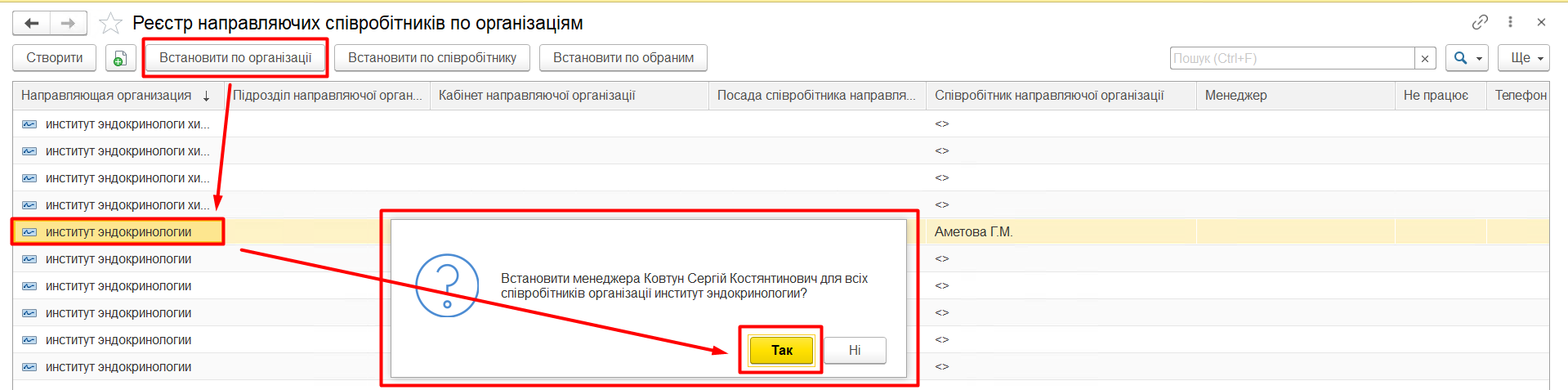 Налаштування одного менеджера відразу по всім записам реєстрів організації або направляючого співробітника.