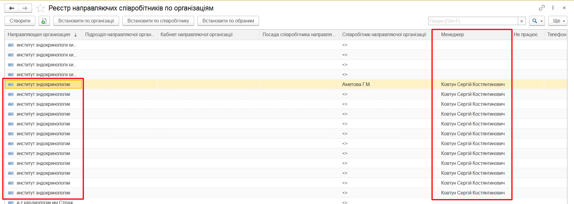 За допомогою реєстру «Менеджери закріплені за направляючими організаціями» є можливість вести облік закріплених менеджерів або за організацією або за лікарем.