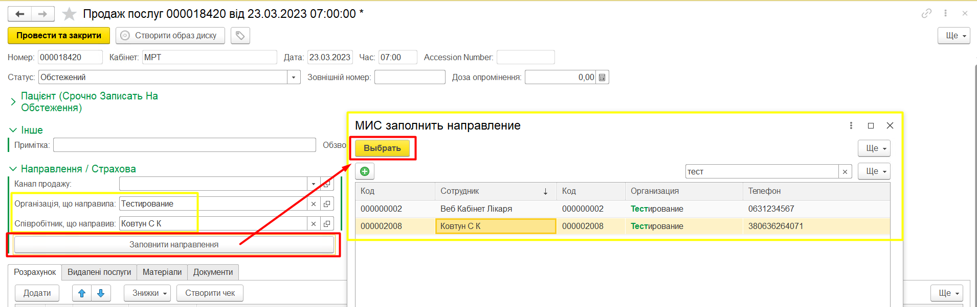 Після того, як створено реєстр, в документі Продаж послуг можна обрати потрібного лікаря і організацію.