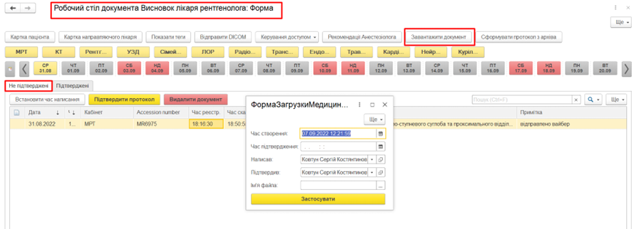 Якщо зовнішній лікар рентгенолог безпосередньо не працює в МІС, він може надати протокол у вигляді Word-файлу для завантаження в МІС.