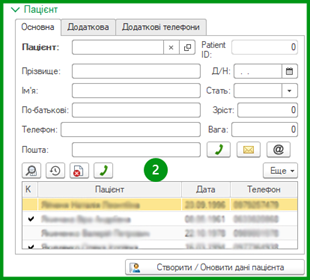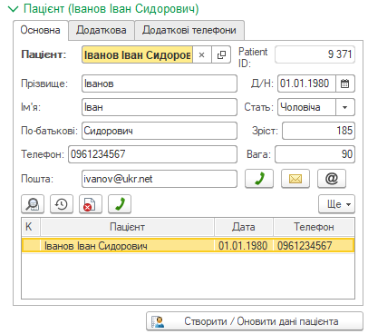 Кнопка «Створити / Оновити дані пацієнта» використовується лише тоді коли змінюються саме вищенаведені дані пацієнта розміщені на вкладках: «Основна», «Додаткова» і «Додаткові телефони, починаючи з прізвища і закінчуючи додатковими телефонами.