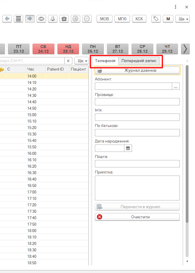 Якщо в момент виклику поле «Пацієнт» не заповнене, є сенс одразу після взяття слухавки і появи панелі (або заповнення даних в ній, якщо вона відкрита) натиснути кнопку «Перенести в журнал», тоді «абонент» буде перенесений в блок «Інформація про пацієнта» зліва, а поля в телефонії будуть одразу очищені і вся подальша робота вже буде проходити «зліва», а панель телефонії можна буде закрити.