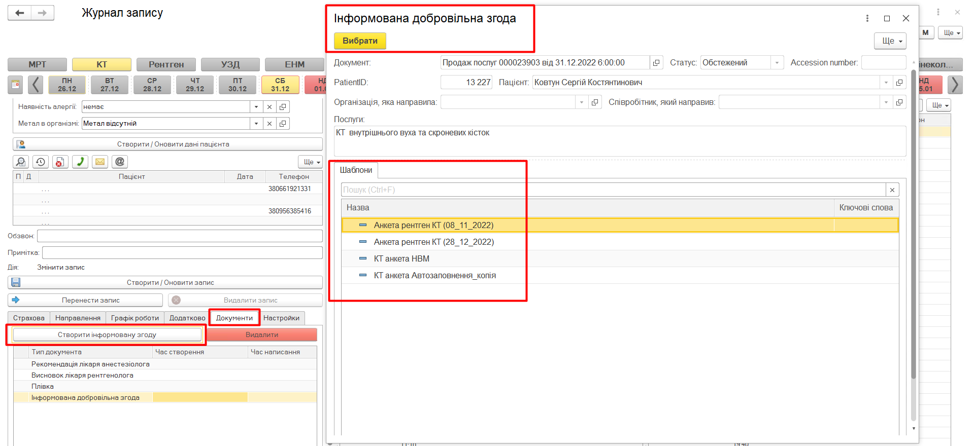 Вкладка Документи дає змогу швидко створити і роздрукувати інформовану згоду пацієнта та подивитися інші медичні документи пацієнта.