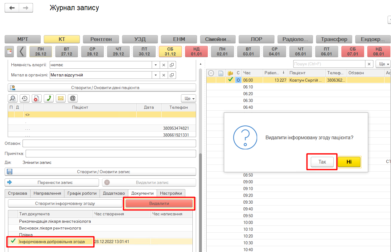 Якщо видаляється той самий пацієнт, який є вибраним то з поля «Пацієнт» він автоматично зникне і поля даних пацієнта будуть очищені.