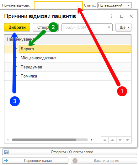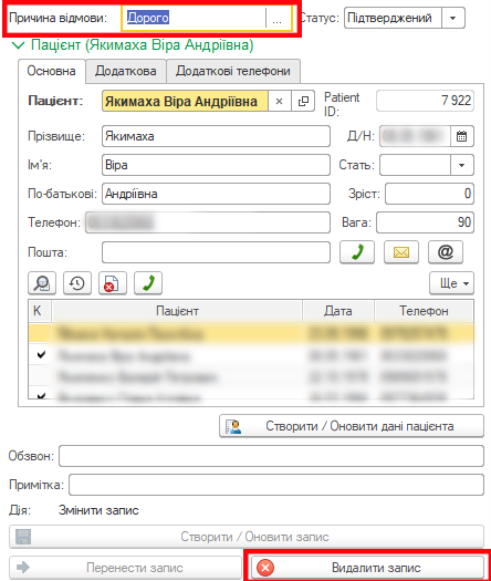 Натиснувши кнопку «Створити / оновити запис» введені дані з лівої панелі переносяться в рядок журналу, після чого відбувається скидання резервування часу і очищення даних запису (поля обстеження і пацієнта), а також очищення поточної дії. Це свідчить про те, що поточна дія завершена успішно і можна виконувати інші дії.