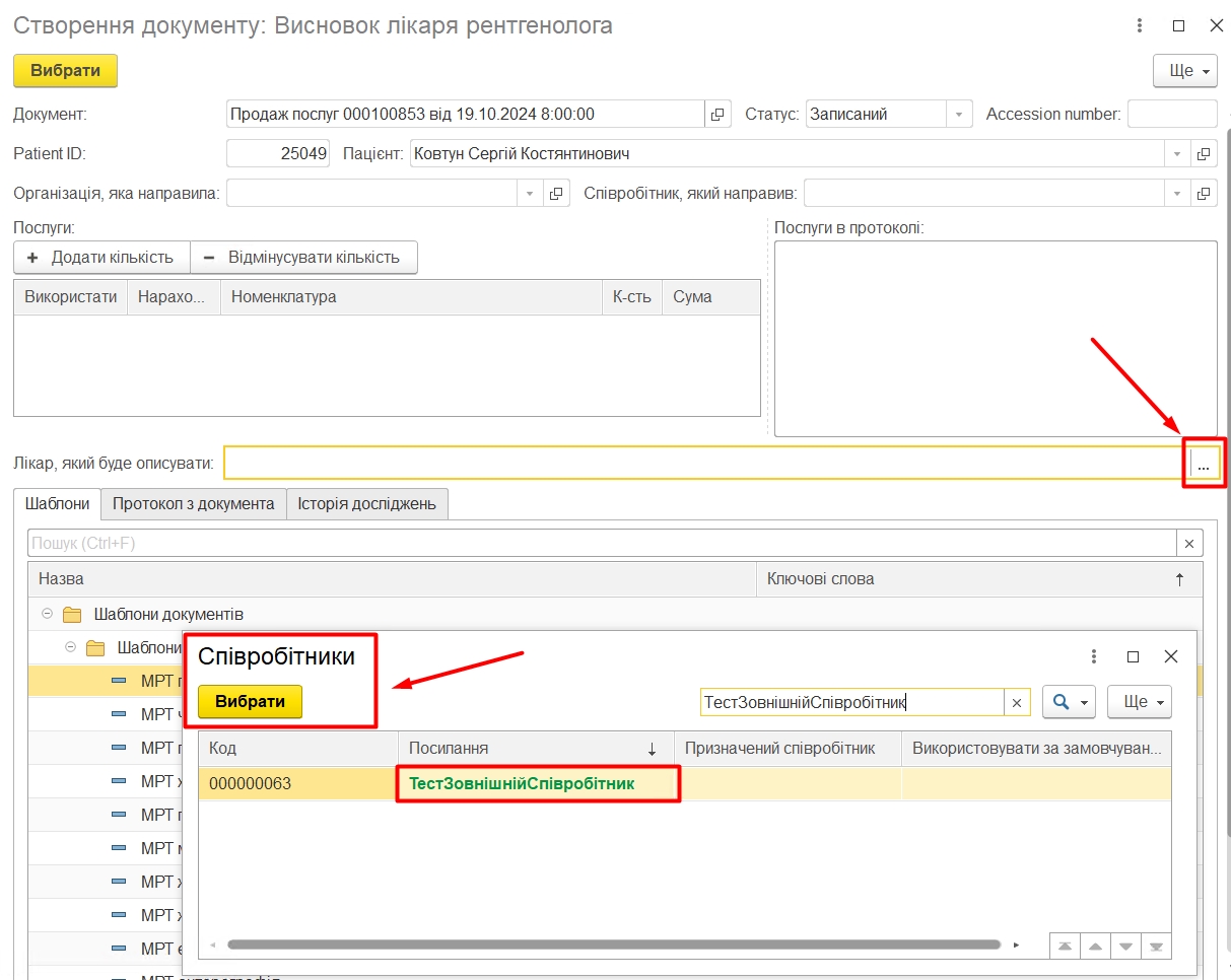 а потім обрати потрібний шаблон протоколу (який лікар зможе видалити, якщо він йому буде непотрібен).