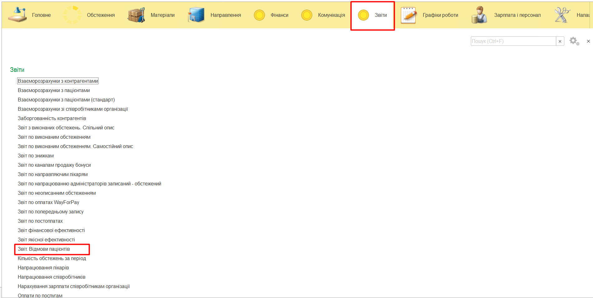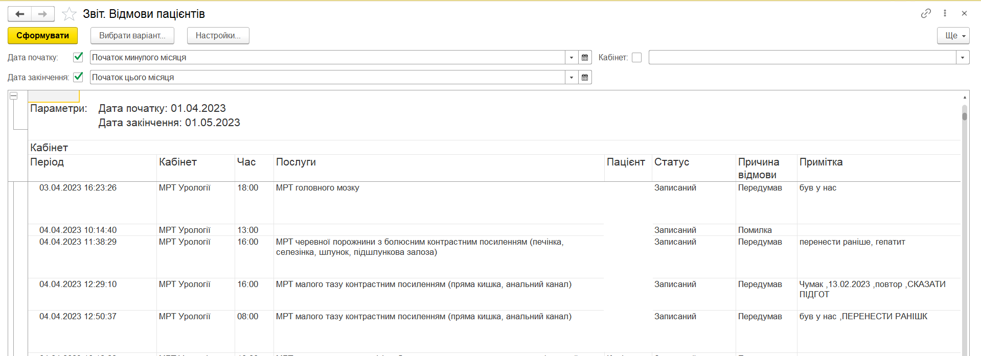 Для аналізу відмов пацієнтів необхідно вибрати в меню «Звіти» - «Звіт.Відмови пацієнтів»