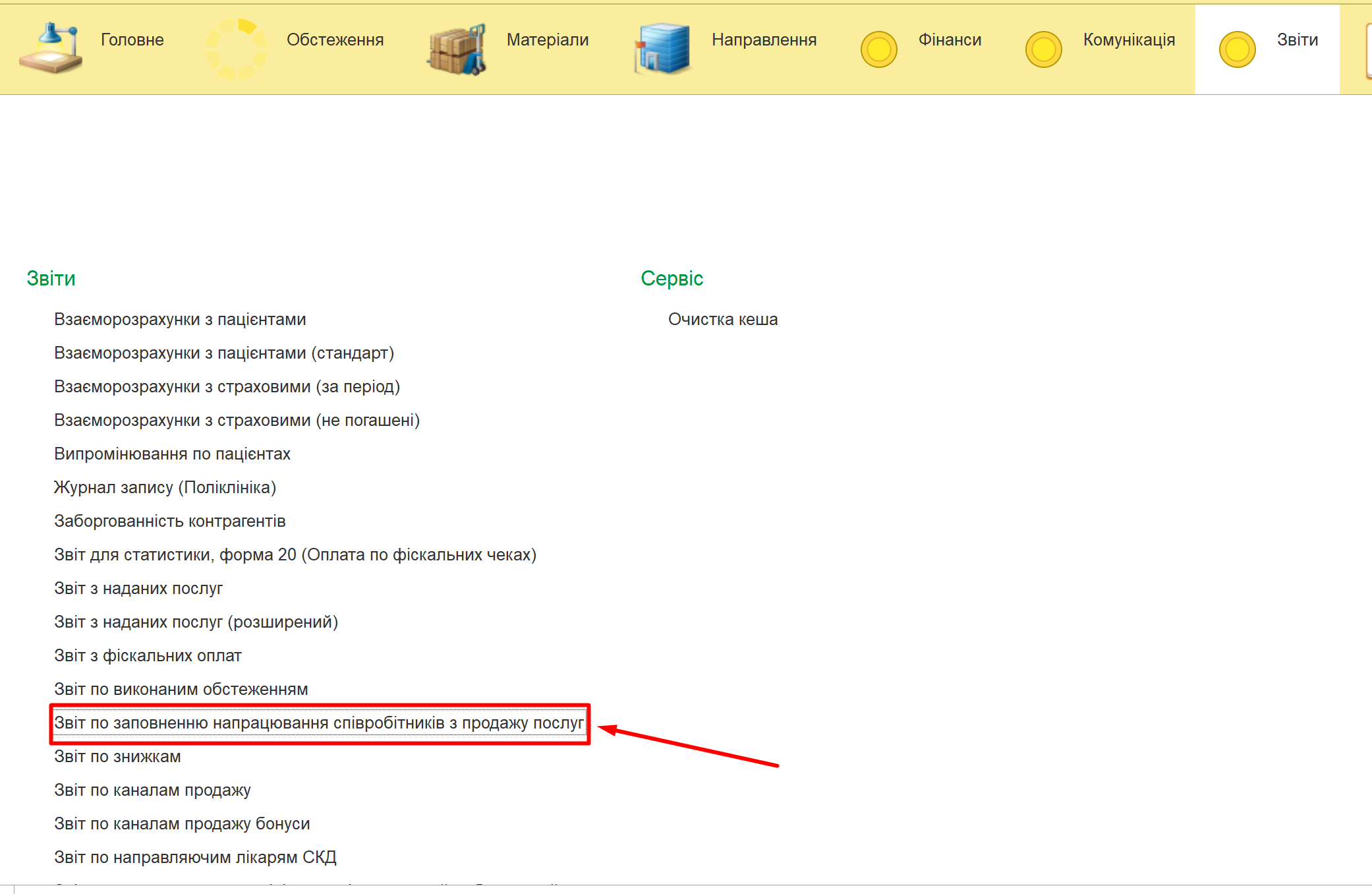 Звіт знаходиться в меню «Звіти» - «Звіт по заповненню напрацювання співробітників з продажу послуг»
