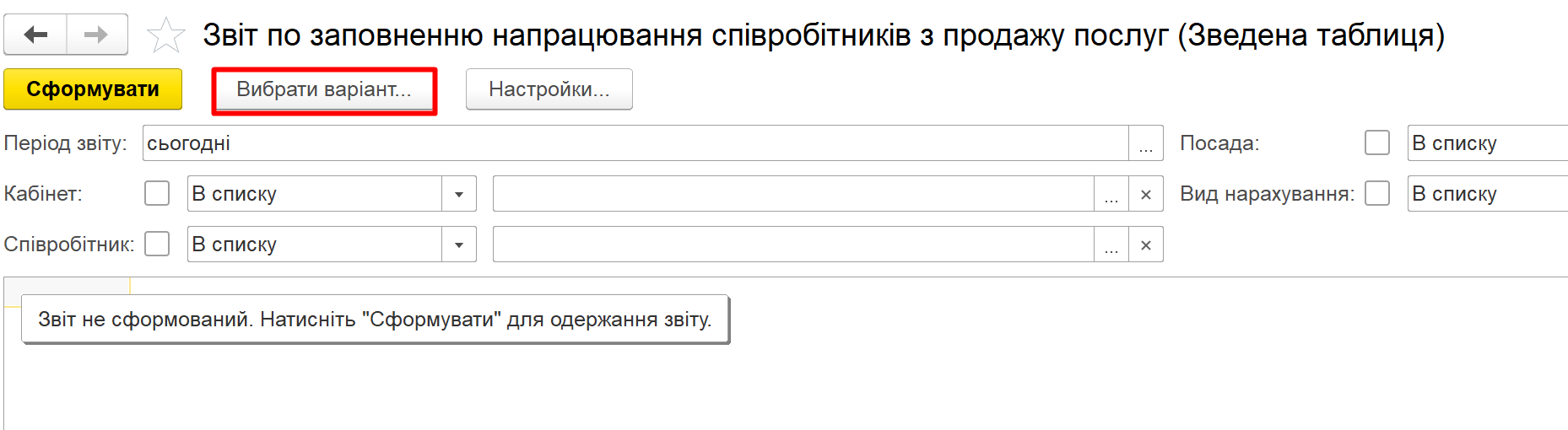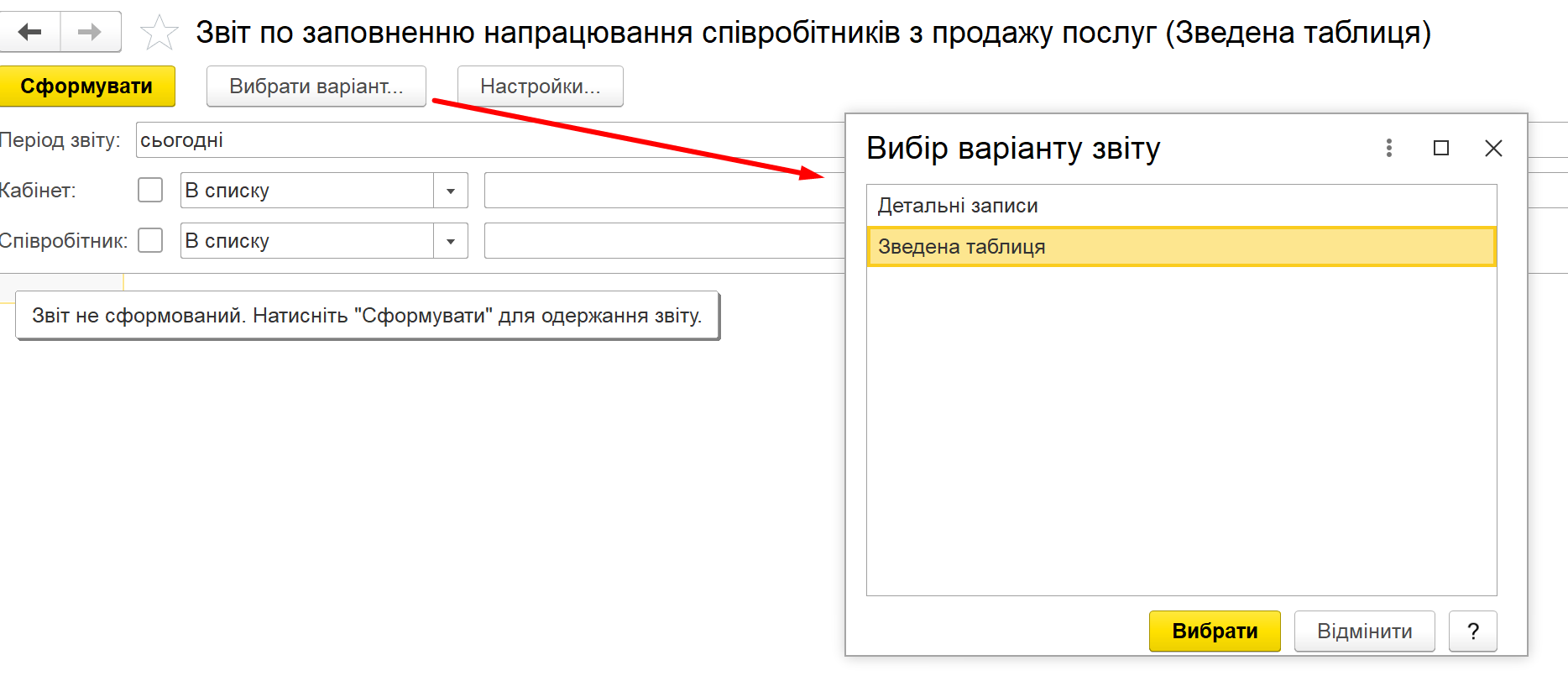 В МІС користувач може обрати доступний варіант звіту. Для цього потрібно натиснути кнопку «Вибрати варіант» та обрати потрібний.