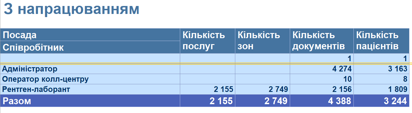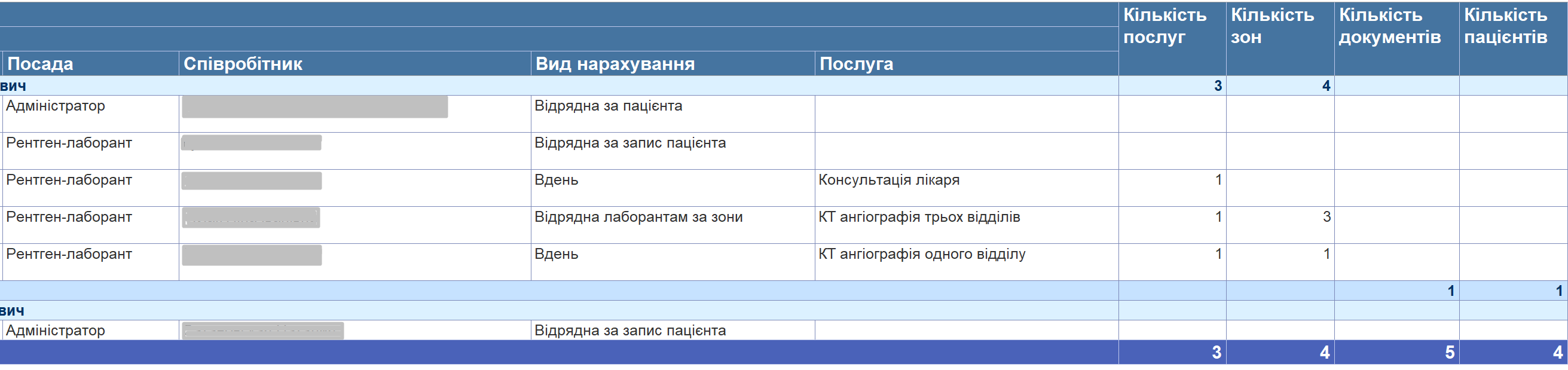 Кількість наданих послуг, обстежених зон, створених документів та обстежених пацієнтів співробітником.