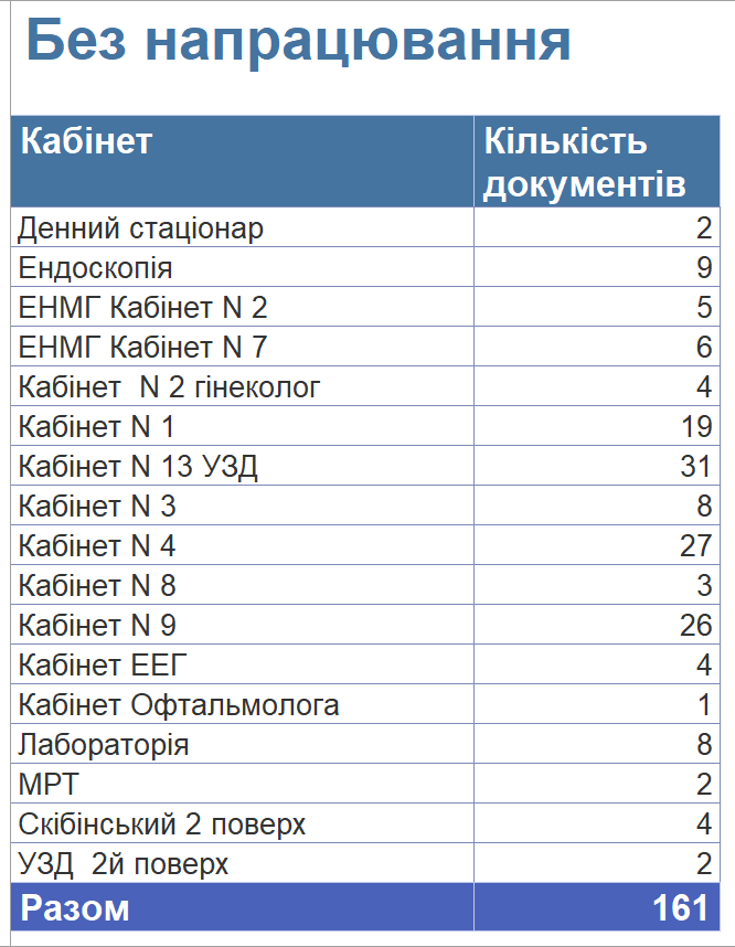 В таблиці «Без напрацювання» відображається перелік кабінетів з кількістю документів в яких не зазначені напрацювання.