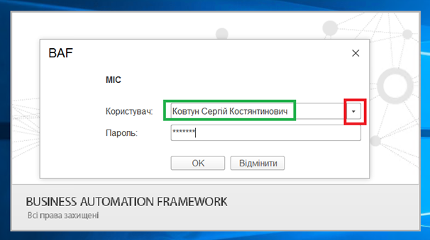 У вікні авторизації вибрати ваше ім’я (або ім’я користувача, під яким будете працювати) та ввести пароль.