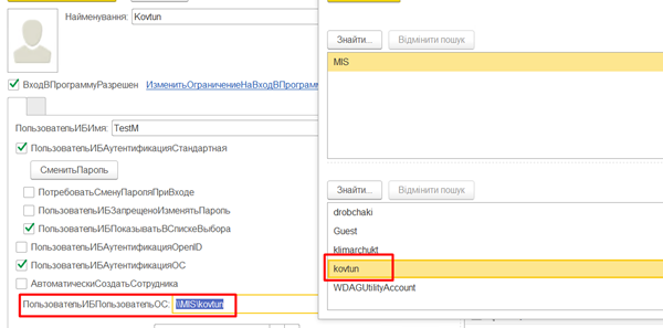 Після цього нижче активується поле «КористувачІБКористувачОС» в якому потрібно «Знайти» користувача, який буде автоматично авторизуватись в МІС.